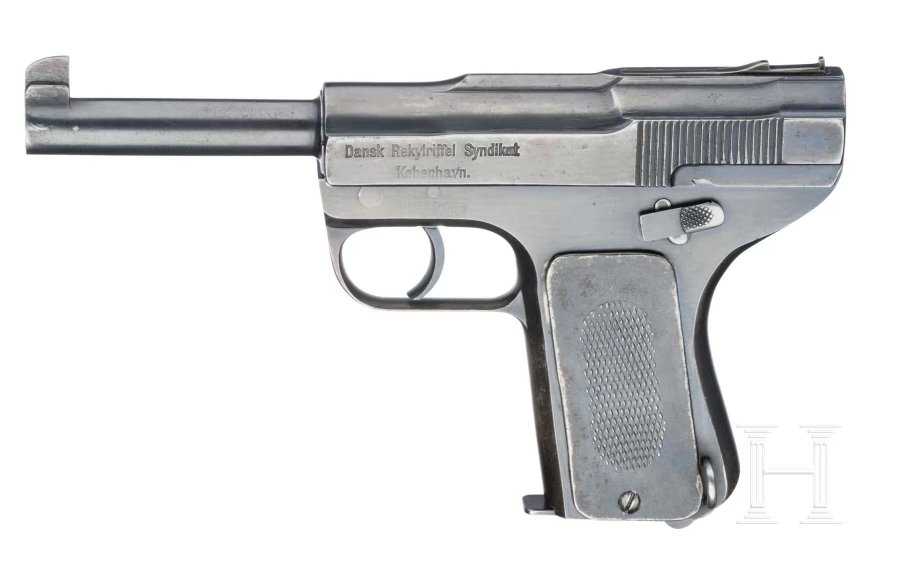 Originariamente camerata in calibro 7,65 Browning, ne furono realizzate varianti in diversi calibri, tra i quali il .45 ACP, e prese parte senza successo alla fase preliminare dei test per l’adozione della pistola semiautomatica degli USA. Fu allora presentata all’esercito britannico, ma con la stessa sfortuna. Nel 1917 la produzione cessò dopo che ne furono costruiti circa 1000 esemplari, di cui quelli con matricola da 1 a 100 sono considerati prototipi. Anche la Schouboe è una pistola con scatto in sola singola azione, ma con cane interno, canna scoperta da 130 millimetri e guancette in lamiera zigrinata. Sul lato sinistro del carrello è rullata la scritta "Dansk Rekylriffel Syndikat/Kobenhavn" Le versioni in calibro 11,35x62 Madsen come quella in vendita da Hermann Historica sono decisamente più rare di quelle in 7,65. Il numero di matricola di questo esemplare è 319. Il prezzo di partenza per questo lotto è di 5.000 euro.