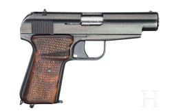 Il lotto 7431 è una pistola davvero difficile da vedere nelle vetrine dei collezionisti, e di cui si sa poco. Si tratta di una pistola di produzione spagnola ECIA modello 1930 in calibro 9mm. La “Fábrica de Armas Esperanza y Cía S.A.” (ECIA) fu fondata nel 1925 da Juan Esperanza Salvador, dopo la sua separazione professionale da Pedro Unceta con cui aveva fondato la "ASTRA-Esperanza y Unceta”, fabbrica di pistole attiva dal 1908 al 1997. Questa semiautomatica dall’aspetto estremamente “spagnolo” fu realizzata con diverse lunghezze di canna e in diversi calibri (6,35mm, 7,65, 9 Corto e Largo) e fu una delle prime con scatto in doppia azione. L’esemplare in vendita da Hermann Historica ha numero di matricola 38, una canna lunga 102 millimetri e riporta i punzoni del 1929. Ha una inconsueta sicura posizionata sopra al pulsante di sgancio del caricatore. Altra particolarità inconsueta è la finestra sul lato sinistro del carrello che mostra la presenza di un eventuale cartuccia in camera. Le guancette sono in legno di noce senza zigrinature. L’anello per il correggiolo suggerisce delle ambizioni militari per questa pistola estremamente rara e di cui si sa davvero poco: è citata nel libro Astra Firearms di Leonardo Antaris.