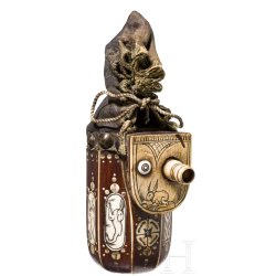 Un altro pezzo da novanta è il lotto 2089, una raffinata fiaschetta per la polvere con corpo ottagonale in legno di noce decorato con finissimi intarsi in osso, proveniente dalla Slesia e risalente al 1650. Anche il beccuccio per l’erogazione della polvere è in osso, decorato con incisioni. Questa magnifica tipologia di fiaschetta fu realizzata solo per breve tempo ed era legata ai fucili a ruota di tipo di piccolo calibro di lusso. Unisce il più alto livello di artigianato a una praticità senza pari. La borsetta in pelle con chiusura a laccio fissata al corpo della fiaschetta conteneva le palle in piombo. Il prezzo di partenza per questo lussuoso accessorio parte da 5.000 euro.