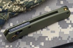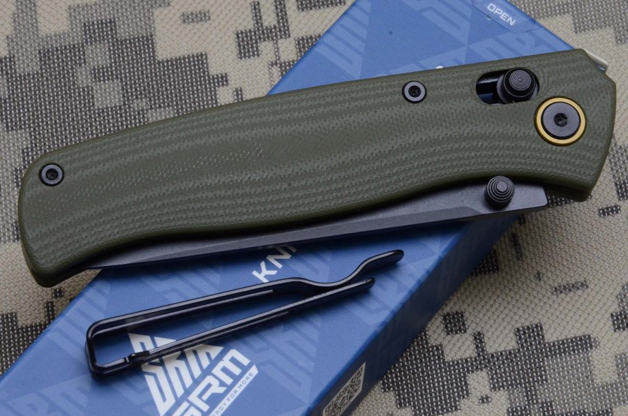 La lama del nostro 255L è costruita in acciaio inox 10Cr15CoMoV lunga 82 millimetri per uno spessore di 3,2 millimetri. Il profilo della lama è di tipo drop point con affilatura liscia e bisellatura alta. La nostra versione ha la lama con finitura PDW nera, ma è disponibile anche una variante con lama inox satinata e impugnatura in G10 grigio. La marcatura sulla lama è piuttosto discreta e si limita al logo del produttore sul lato sinistro, mentre su quello destro troviamo l’indicazione del modello e, cosa abbastanza inconsueta, il numero di matricola. Il perno di basculaggio della lama ruota su cuscinetti a sfera, e le operazioni di apertura o chiusura non presentano alcuna difficoltà: è possibile aprire la lama semplicemente arretrando i perni dell’Ambi Lock e lasciando fare alla forza di gravità il resto. L’affilatura di fabbrica è molto buona e la finitura PDW della lama non presenta alcuna incertezza o difformità.