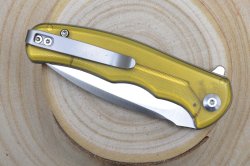 Le guancette di colore giallo hanno la superficie solcata da zigrinature diagonali che rendono eccellente la presa senza interferire troppo con la trasparenza del materiale; in questo modo le piastrine in acciaio dell’impugnatura sono visibili e le loro fresature di alleggerimento diventano un elemento estetico e caratterizzante del Mini Praxis. La clip in acciaio inossidabile è presente sul solo lato destro e consente il porto in posizione “tip up”. Una volta tanto non c’è la possibilità di spostarla da un lato all’altro, ma questo non è necessariamente un male. Al contrario, si evitano le guancette crivellate da fori che saranno anche comode per chi vuole modificare la posizione della clip, ma esteticamente sono abbastanza discutibili. Anche le viti sono in acciaio inossidabile, e visto il prezzo finale, non di possono certo pretendere quelle in titanio.