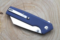 La lama del Civivi Mini Praxis è in acciaio D2 temprato alla durezza di 59-61 HRC, ha un profilo drop point ed è caratterizzata da una bisellatura alta e da un falso controfilo a tutta lunghezza del dorso che creano un piacevole effetto estetico e rendono la lama piuttosto leggera, grazie anche allo spessore di 2,5 millimetri. Questo concorre a rendere il Mini Praxis relativamente leggero in rapporto alla lunghezza: solo 73 grammi. Da segnalare l’eccellente esecuzione dei piani e dell’affilatura di fabbrica. La linea della lama è resa ulteriormente pulita e filante dall’assenza di pioli o fori per l’apertura, che è invece affidata a un flipper laterale facile da azionare e ben sagomato. Per forma e lunghezza la lama è un eccellente compromesso per l’uso quotidiano.