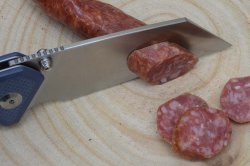 Il secondo modello che vi presentiamo si chiama Amirite e appartiene a una classe dimensionale superiore, con una lama lunga 88,3 millimetri e una lunghezza totale di 213,5 mm. Anche il peso è notevolmente più alto: 130 grammi che sono quasi il doppio rispetto al Mini Praxis, ma anche la capacità di taglio è notevolmente superiore. L’Amirite, infatti, dispone di una lama in acciaio Nitro V5 con profilo “Reverse Tanto” ovvero tanto rovesciato. In pratica si tratta di una mozzetta, con un angolo della punta un po’ più pronunciato rispetto a quello del coltello tradizionale italiano. Questo crea una vera e propria punta in stile cutter che consente di fare lavori di grande precisione. Lo spessore massimo della lama è di 3 millimetri, ma la bisellatura piana dei fianchi la rende relativamente leggera ed efficiente, aspetto sottolineato da una affilatura di fabbrica davvero notevole. La finitura satinata è altrettanto ben realizzata, regolare e priva di incertezze. La lama dell’Amirite è ideale per tagli precisi ma anche per preparare alimenti: durante i nostri test abbiamo appurato che taglia i salamini in modo impeccabile.