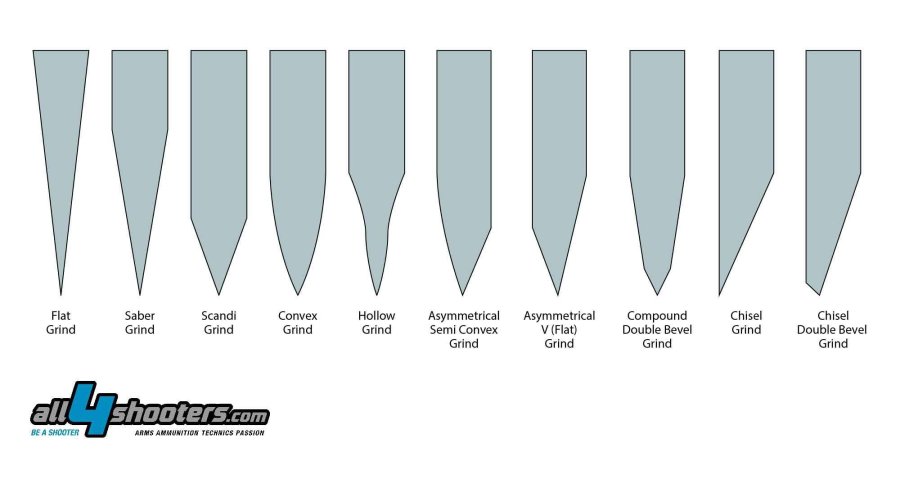Grind: molatura. Indica la geometria dei piani della lama a seconda dei differenti metodi di molatura; vediamo di spiegarne in parole semplici alcuni dei più comuni. Flat grind, molatura piana: i fianchi della lama digradano dal dorso alla punta con un angolo costante. Saber grind, molatura a sciabola, i fianchi della lama sono paralleli per circa un terzo dell’altezza, poi digradano con angolo costante. Scandi grind, molatura scandinava, simile alla molatura a sciabola, ma a proporzioni invertite. Convex grind, molatura convessa, i fianchi della lama sono incurvati verso l’esterno. Si tratta di una molatura tipica delle asce. Hollow grind, molatura concava, i fianchi della lama sono curvi verso l’interno, tipica dei rasoi a mano libera. Chisel grind: molatura a scalpello, tipica di alcune lame da lavoro e da cucina orientali. Un lato della lama è completamente diritto, mentre l’altro digrada verso il filo con un angolo variabile in base all’altezza della lama. Una sua variante è la Chisel double bevel grind dove il lato diritto della lama presenta una molatura inclinata verso l’interno nel tratto distale. Asymmetrical grind: molatura asimmetrica dove ciascun lato della lama ha una molatura diversa dall’altro. Può offrire combinazioni tra molature diritte, concave o convesse.