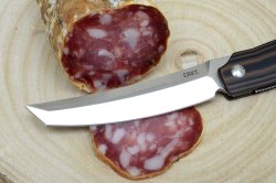 Cominciamo dalla lama che è in acciaio D2 e ha una forma piuttosto sinuosa, che viene appunto definita “Tanto” ma in realtà è qualcosa di più dal momento che ha una bisellatura doppia di tipo “hollow ground” che la rende molto elegante. Lo spessore massimo della lama, quindi, non è in corrispondenza del dorso, ma della sua parte centrale, ed è pari a 3,12 millimetri. Il controfilo, che, come tale, non è affilato, è spesso solo 1,2 millimetri e corre per tutta la lunghezza della lama. L’acciaio inossidabile D2 ad alto tenore di cromo e carbonio è una scelta interessante poiché vanta una tenuta del filo superiore rispetto al 440C e al N690 e anche all’ATS 34 e mostra una buona resistenza alla corrosione. Tornando alla lama del CRKT Ancestor, il suo livello di lavorazione è il consueto, cioè eccellente, con una buona affilatura di fabbrica e una finitura satinata molto omogenea che fa da sfondo ai marchi, fortunatamente poco invadenti, con la sigla del produttore sul lato sinistro e “Caston Design” su quello destro, dove troviamo anche il microscopico numero di codice. La durezza dichiarata della lama è di 60-62 HRC mentre la lunghezza di 91,5 mm è più che sufficiente per affrontare compiti quotidiani, tra i quali il fondamentale taglio del salame. Azionando il piccolo flipper laterale, poco sporgente ma decisamente comodo, la sinuosa lama si apre in modo molto dolce, ruotando su un perno dotato di cuscinetti a sfera (sistema IKBS) e si blocca in apertura con un avvertibile click. Lo sblocco del liner lock è morbido e non richiede alcuno sforzo, pur mantenendo saldamente bloccata la lama.