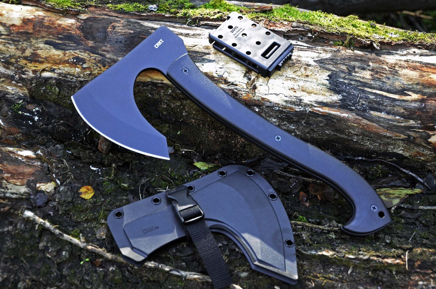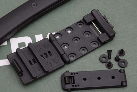 La Skeggox di CRKT viene consegnata con un fodero in polimero che ne avvolge completamente la testa, e che grazie al sistema M.O.L.L.E. e una clip a sgancio rapido della Dots in dotazione può essere portato alla cintura, o meglio agganciata a uno zaino. La ritenzione è affidata sia all’elasticità del materiale sia a un passante con fibbia in plastica a sgancio rapido ed è molto tenace, per cui è assai improbabile che lo strumento possa sfilarsi incidentalmente, in seguito a salti o cadute.