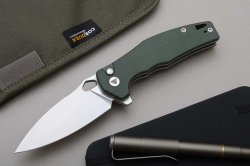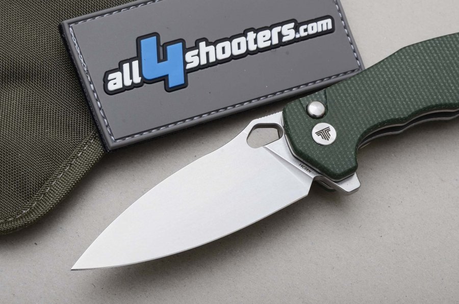 L’impugnatura del modello fotografato è in Micarta di colore verde, dalla superficie leggermente zigrinata che offre una buona presa senza grattare le dita dell’utente. In alternativa è disponibile in micarta di colore nero o in G10 con tonalità sabbia. Le guancette sono fissate a una coppia di robuste piastrine in acciaio inox dallo spessore di 1,5 millimetri, alleggerite nella parte centrale da alcune fresature passanti che ne riducono il peso (99 grammi) senza intaccare la solidità del coltello. La clip per il porto in condizione tip-up (quindi con la punta verso l’alto) è in acciaio inox, fissata all’impugnatura da una coppia di grani Torx, ed è reversibile da un lato all’altro.
