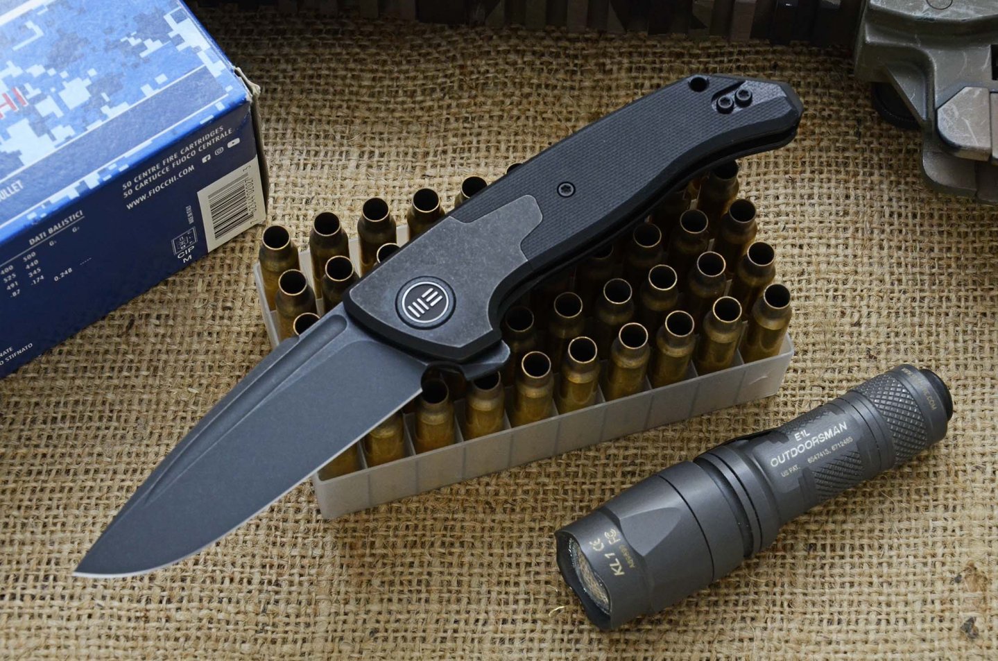 Piastrine e testine sono realizzate in un solo pezzo di titanio 6AL4V sul quale sono applicate due guancette in G10 di colore nero (ma ci sono anche in nero e blu) dalla fine zigrinatura. Dalla coda dell’impugnatura sporge una cresta rastremata che in caso di necessità può essere usata come percussore. Sul lato destro dell’impugnatura troviamo una clip in acciaio che consente il porto con la punta verso l’alto (tip up). Come tocco di classe, la sagoma della clip è leggermente incurvata verso il basso; quindi, non sarebbe simmetrica se venisse montata sul lato opposto. L’elegante soluzione di We Knife è fornire con il coltello una clip speculare aggiuntiva. La lama ha un profilo drop point caratterizzato dallo sguscio rastremato che troviamo su entrambi i suoi lati. Realizzata in acciaio CPM 20CV con finitura stonewashed nera, misura 80 mm di lunghezza per 3,2 mm di spessore. Sul lato sinistro della lama troviamo il logo di Elishewitz e null’altro; la cosa mi piace perché rispetta il look molto oscuro di questo coltello. Il logo del produttore c’è e lo troviamo sul perno di basculaggio della lama. C’è anche una versione con lama di tipo american Tanto, ma a mio parere non ha molto da aggiungere. L’apertura della avviene agendo su un flipper laterale dal profilo molto curato: si trova subito ma non sporge tanto da disturbare la manipolazione del coltello. La lama si blocca con un click ben udibile e si sblocca senza la minima fatica. Certamente ci troviamo di fronte a un coltello pensato con cura e ben eseguito. Nell’insieme il Press Check è un chiudibile compatto e maneggevole anche per chi ha mani medio-grandi.