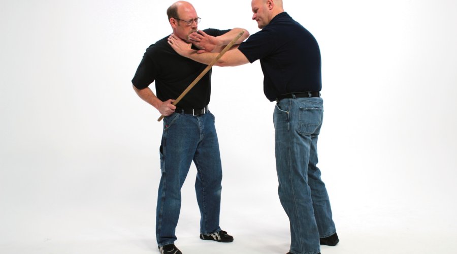 Se, tuttavia, non abbiamo la possibilità di schivare il colpo arretrando, allora spostiamo la mano sinistra sopra le braccia dell'attaccante e il bastone con la mano destra così che possiamo aggrapparci ad esso con la mano sinistra e più o meno prendere la posizione di guardia con entrambe le mani. Ora le braccia dell'aggressore sono sotto il braccio sinistro e il bastone. Portiamo la nostra mano destra contro il nostro fianco e facendo forza con i muscoli della schiena tiriamo il gomito sinistro all’indietro verso la parte superiore del nostro corpo. Con questo movimento il bastone viene tirato dolorosamente sui nervi radiali degli avambracci intrappolati dall'aggressore, dissolvendo la stretta mortale. Inoltre, tiriamo l'attaccante ancora più vicino a noi con la parte superiore del corpo inclinata. Non appena la presa viene rilasciata, colpiamo il volto dell'aggressore con la parte centrale del bastone brandito con entrambe le mani. Se necessario, concludere la sequenza con un potente colpo allo stinco o al ginocchio dell'aggressore.