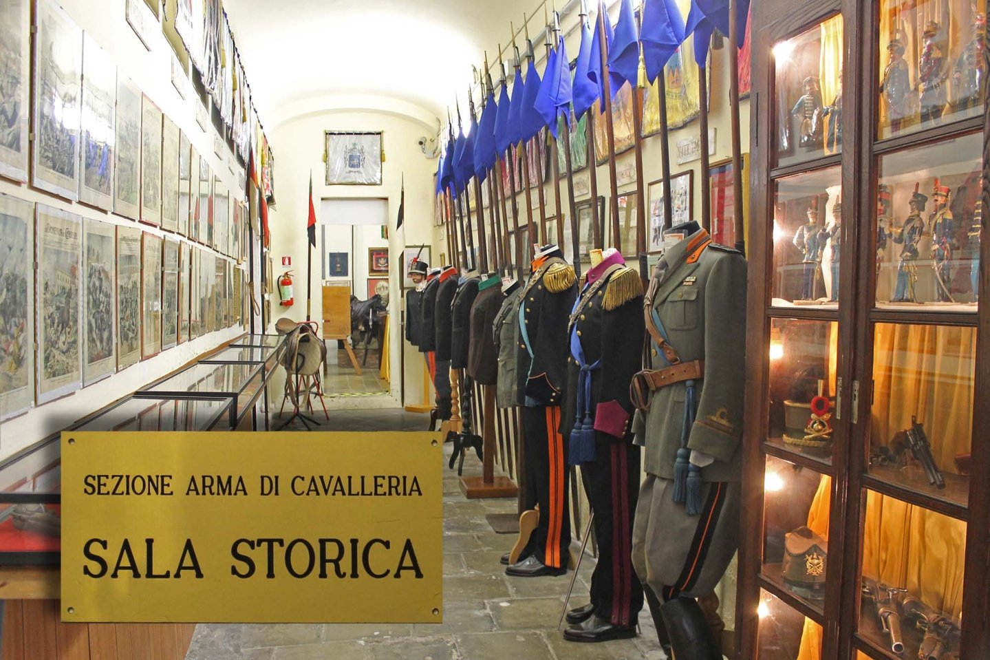 La "Sala Storica della Cavalleria", si è andata costituendo raccogliendo nel tempo, grazie al volontariato dei soci, una grande quantità di stendardi, divise, decorazioni, gagliardetti, lance, armi da taglio e da fuoco, cimeli, plastici e soldatini di epoche diverse, oltre a fotografie e documenti. Ed è quindi divenuta un’esposizione di grande rilevanza a livello nazionale, in grado di documentare con efficacia le varie fasi di passaggio di storia militare nazionale nella quale l'Arma di Cavalleria ha giocato un ruolo di primaria importanza abbracciando un periodo che va dalla fine dell’800 al 1945. La raccolta, si è ulteriormente ampliata nel corso degli ultimi anni, arrivando a comprendere oltre 65 manichini con uniformi d’epoca (dalla “gran Tenuta” nera, al grigio-verde, al coloniale, ai gruppi di combattimento dell’Esercito del Sud). Tutti i reperti sono il frutto di donazioni e acquisizioni. I più antichi, fra cui gli stemmi dei trenta reggimenti della cavalleria sabauda, testimoniano le nobili origini dell’Arma prediletta dai sovrani, in particolare da Carlo Alberto di Savoia, che nel 1831 ricostituì il reggimento Lancieri d’Aosta con il nome di Aosta Cavalleria.