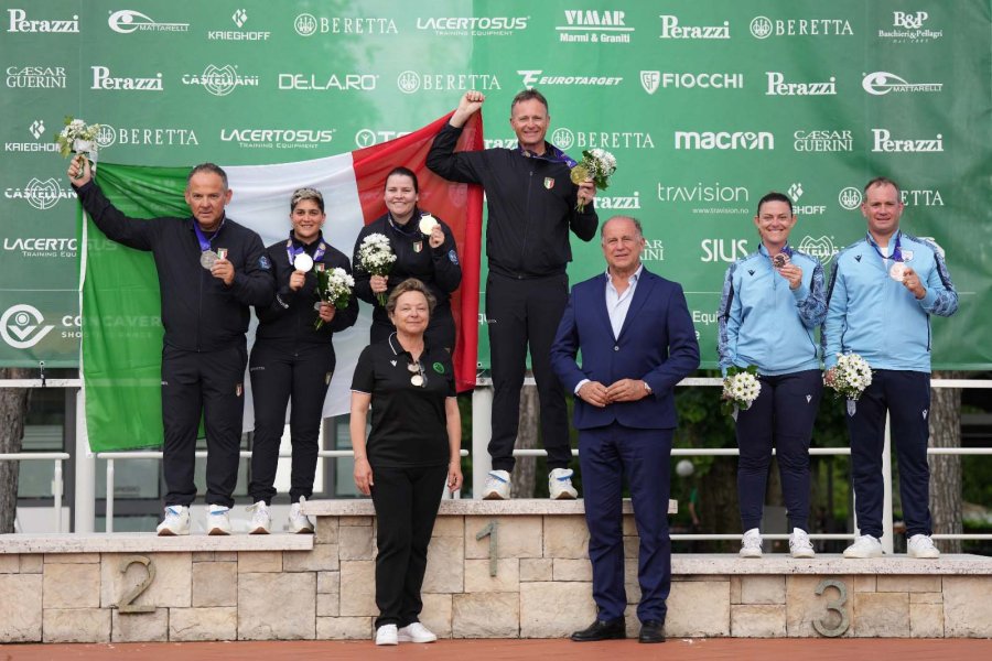 Al maschile si impone Riccardo Mignozzetti (119/125+2 e 54/60), seguito sul podio per l’argento da Marco Coco (53/60), terzo Panagiotis Gerochristos (43/50). Nella classifica a squadre Coco con Matteo Bragalli, quinto individuale con 25/30, e Antonio La Volpe si meritano l’oro a squadre con 358/375 davanti a Germania (345) e Grecia (343).
