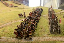 La cavalleria fiorentina superiore in numero a quella aretina poteva contare su una prima linea di circa 150 uomini (i Feditori) seguita a breve distanza da un secondo schieramento di oltre 1000 uomini. Per quanto riguarda la fanteria, anch'essa superiore in unità rispetto a quella ghibellina e soprattutto meglio equipaggiata, oltre allo schieramento centrale costituito da 6000 uomini rispetto ai fanti di Arezzo, poteva contare ai due lati della formazione sui Palvesari, soldati dotati di grandi e pesanti scudi che venivano poggiati sul terreno a fare da protezione ai balestrieri che potevano così tirare in tutta sicurezza anche perché a loro ulteriore difesa contro eventuali cariche della cavalleria nemica vi erano reparti di picchieri; in tutto le ali contavano 2000 uomini per lato.