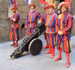 La colubrina era un piccolo tipo di artiglieria terrestre leggera in grado di esplodere colpi in rapida successione. Molto maneggevoli, si caricavano facilmente, avevano palle di ferro ed una lunga gittata con carica relativamente piccola. Per quanto riguarda l’uniforme i bombardieri indossano un giubbone a strisce verticali rosse e azzurre, bordate di panno giallo. Le brache sono in stamina di lana gialla con tiracchie di panno rosso e azzurro. Berrette di panno rosso piumate, cinture di cuoio grezzo, calze e scarpe rosse completano il loro abbigliamento. I bombardieri sono armati di Fusetto, una specie di pugnale simile ad uno stiletto a lama triangolare che veniva utilizzato anche come strumento per misurare il calibro dei cannoni e il diametro delle palle grazie a delle tacche incise sulla sua lama. Il Capobombardiere porta una spada finemente lavorata con elsa a croce e controguardia ad anello e conchiglia.