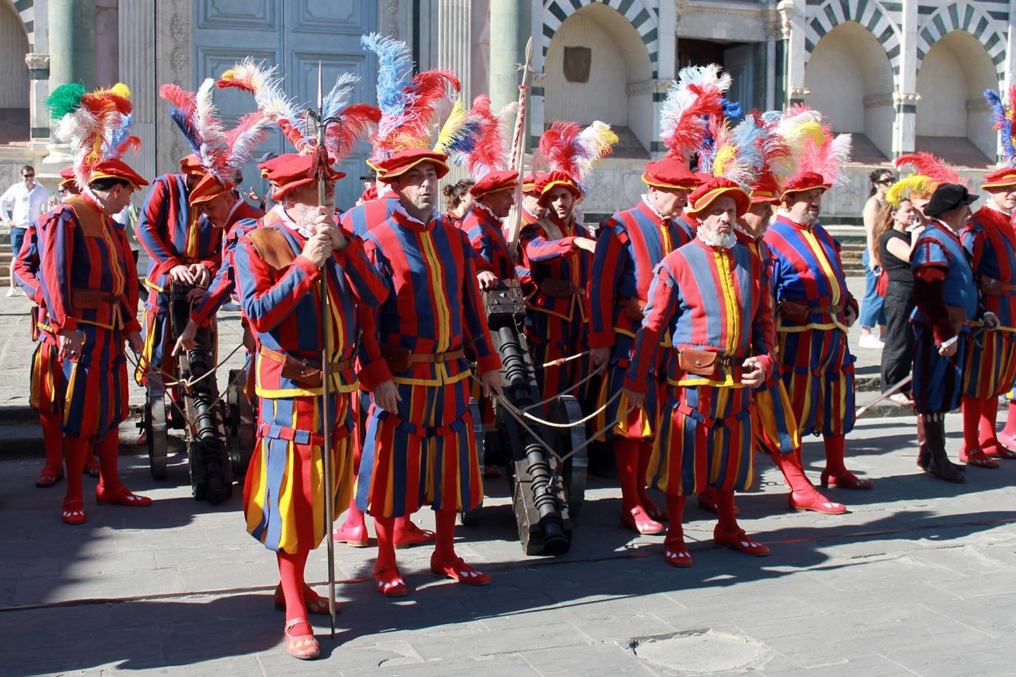 Fanti di palazzo: in origine i 100 fanti che proteggevano Palazzo Vecchio, sede cittadina dell’amministrazione e del potere. Il loro armamento consiste in una spada con guardia a croce; una picca; un pugnaletto per bandieraio con lama diritta a due fili del tipo così detto “smagliature” o “sfonda giaco” che permetteva di penetrare attraverso le maglie di ferro e ferie l’avversario, con impugnatura a fornimento ionico atto a proteggere la mano. Il loro capitano porta una spada con fornimento a gabbia. I fanti di palazzo vestono un giubbone di pilor marrone con maniche di panno gialle con sei righi neri circolari posti in diagonale e alotto rosso. Le brache sono di panno rosso soppannate di stamina bianca, calze e scarpe rosse, berretta gialla o rossa piumata (10 per colore). Sono protetti da collarina e corazza composta da pettorale e schienale.