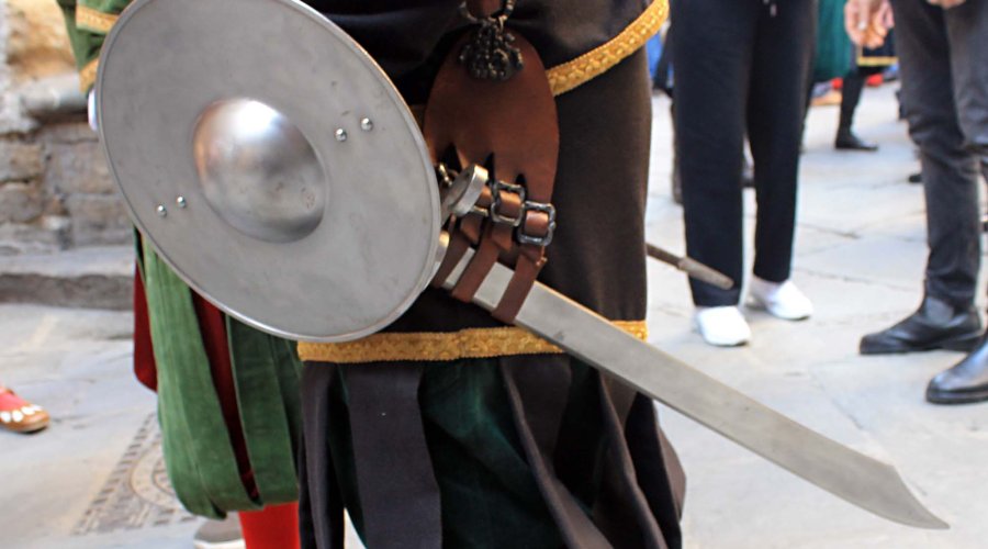 Armati di Parte Guelfa della cavalleria della Repubblica Fiorentina: soldati che affiancavano i cavalieri. Protetti da petto d’arme, di brocchiere (uno scudo piccolo dalle ridotte dimensioni), e dal morione, tipologia di elmo a cresta molto diffusa all’epoca; sono armati di falcione, spada di piccole dimensioni e di origine povera, tant’è che veniva e viene tuttora portata al fianco nuda (senza guaina); era comunque un’arma micidiale in grado di recidere i tendini di Achille degli avversati se ben maneggiata.