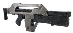 Quando il film Aliens uscì nelle sale era l’anno 1986 e gli appassionati di armi fantascientifiche restarono colpiti dall’arma d’ordinanza dei Marines delle colonie spaziali, ovvero il Fucile a impulso M41A che “spara munizioni calibro 10x24 senza bossolo”. La realtà la potente arma individuale usata nel film è basata su una PM Thompson M1 la cui inconfondibile manetta di armamento a rocchetto è l’unico elemento riconoscibile, in quanto l’arma è completamente racchiusa in un guscio di plastica e alluminio. Il fucile a impulso M41A è dotato anche di un lanciagranate con azionamento a pompa sotto alla canna principale, e l’astina di armamento è stata presa da uno shotgun Franchi SPAS 12. Oltre a cinque o forse sei esemplari in grado di sparare a salve, per la produzione del film furono realizzati alcuni modelli in schiuma di poliuretano da usare nelle scene in campo lungo o per quelle di azione senza spari, dove gli attori avrebbero potuto ferirsi. La replica dell’arma misura 71,25 cm x 26,75 cm x 7,75 cm e mostra diversi segni d’uso. Si tratta di un vero e proprio oggetto di culto per gli appassionati della saga di Alien. Una curiosità: il regista James Cameron in persona disegnò quest’arma di fantasia e scelse come base il Thompson M1, dopo aver scartato l’UZI e L’H&K MP5, perché il mitra americano in calibro.45 produceva delle spettacolari fiammate di bocca con le munizioni a salve per uso scenico. Uno di questi esemplari, ovviamente inerte visto che manca totalmente dei meccanismi interni, è in vendita all’asta a partire da 20mila sterline (circa 24 mila euro).