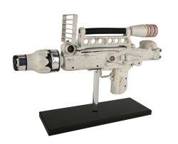 Basato su una pistola mitragliatrice IMI Uzi, il fucile laser è pesantemente personalizzato e dipinto di bianco. È fatto prevalentemente di schiuma di poliuretano, con componenti aggiuntivi di plastica e metallo, tra i quali spicca un curioso mirino a grata. L'arma dello spazio è decorata con strisce d'argento nella parte anteriore e presenta anche decalcomanie a strisce rosse. Dal momento che nel film i fucili spaziali non avrebbero dovuto sparare munizioni a salve, ma raggi laser aggiunti in fase di post-produzione, le “prop guns” del film furono realizzate modificando delle semplici armi giocattolo di plastica.