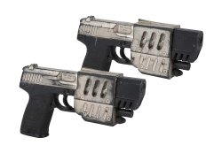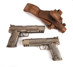 Realizzate in gomma densa, entrambe le armi da fuoco sono versioni modificate delle pistole Heckler & Koch USP Match in calibro 9x19mm. Ognuna ha una sorta di rotaia tra la guardia del grilletto e il dust cover, che è rifinita con vernice color argento per replicare l'alluminio. La marca e il modello di ogni pistola sono visibili sul carrello e sulla sua impugnatura testurizzata, e un finto puntatore laser e una luce sono montati sotto la canna di entrambe le pistole. Le armi presentano una leggera usura dovuta all'uso in produzione, e c'è una crepa su uno dei grilletti. Dimensioni (ogni pistola): 24 cm x 3,5 cm x 13,5 cm. Anche in questo caso si tratta di armi inerti prive di qualsiasi meccanismo di sparo o parte movibile. Il prezzo di partenza per la coppia è di 3 mila sterline (circa 3500 euro).