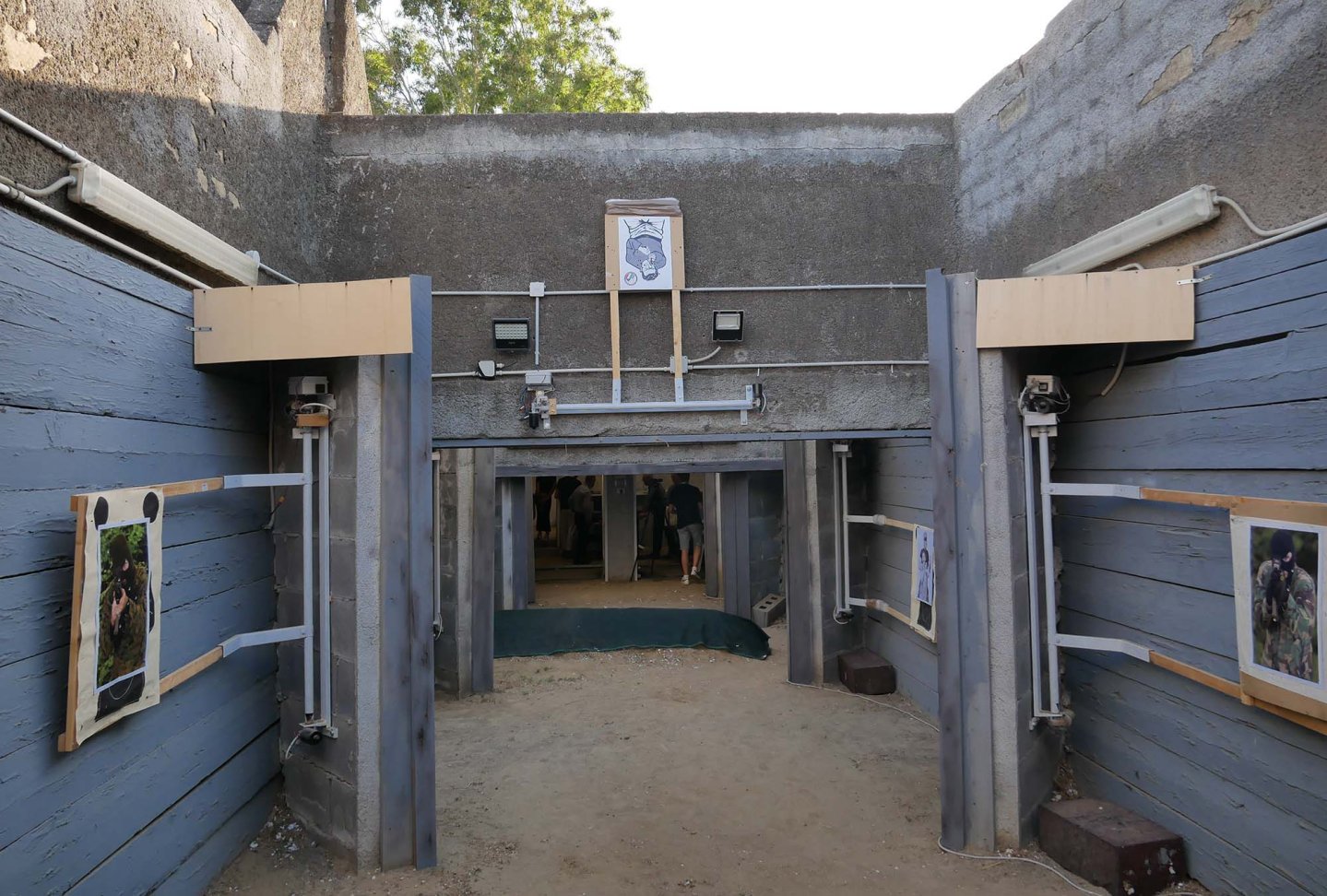 Analizziamo brevemente l’architettura dell’impianto robotizzato. Otto dei dieci bersagli sono occultati da altrettanti muri posizionati a spina di pesce ai lati del campo di tiro: 4 a destra e altrettanti a sinistra su un campo lungo 25 metri. Il bersaglio n. 9, fissato dietro una quinta, si abbassa e si alza con movimento rotatorio longitudinale; l’ultimo bersaglio, il n. 10, è fissato dietro un’altra quinta, ma si abbassa e si alza con movimento rotatorio trasversale come farebbe un pendolo. Questo è forse il bersaglio più difficile da colpire a causa del suo specifico movimento e della notevole distanza dal tiratore. La struttura portante di ciascun bersaglio è stata realizzata utilizzando comuni tubolari d’acciaio, motorini tergicristalli per auto e, limitatamente alla parte esposta ai proiettili, listelli di abete di opportuno spessore.