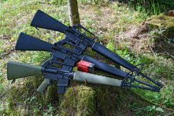 BRN-16A1 Rifle, riproduce il classico M16A1 distribuito a migliaia di soldati americani e caratterizzato da un lower stile M16A1 con “full magazine fence” intorno al pulsante di sgancio del caricatore, upper receiver tipo M16A1, anodizzazione grigio opaco, calciatura nera a spegnifiamma A1 tipo “birdcage” (a gabbia).