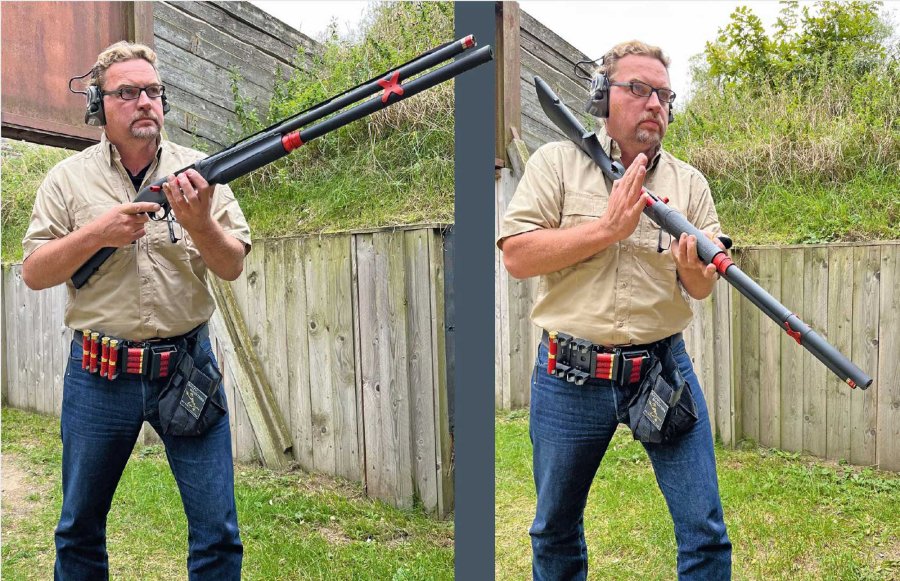 Ma torniamo allo strozzatore long shot: nelle discipline IPSC/action, i "no-shoot" metallici e i popper sono spesso affiancati, e con rosate così strette, i bersagli possono essere ingaggiati in modo pulito senza incorrere in spiacevoli punti di penalità. Abbiamo subito provato a ingaggiare cinque piattelli con questo strozzatore. Abbiamo anche provato la carcassa modificata con finestra di caricamento maggiorata sul lato inferiore. Il pollice scivola letteralmente in direzione del caricatore tubolare e può inserire le cartucce nel serbatoio in maniera affidabile. Il cappellotto spingicartucce sporge leggermente dal tubo serbatoio, e anche operando in velocità, si riescono a sentire le cartucce che vanno a posizionarsi nel caricatore senza incertezze. Un altro vantaggio è che quando il serbatoio è vuoto, il cappellotto rosso segnala immediatamente all'utilizzatore lo stato dell'arma. Abbiamo subito provato il metodo di caricamento preferito nell'IPSC, estraendo quattro cartucce dalla clip da cintura e inserendole con la mano destra nell'arma, abbassata a 45°. Ma poiché il serbatoio non era ancora pieno, le quattro cartucce successive sono state estratte da un altro portacartucce con la mano sinistra e inserite anch'esse nel serbatoio. In questo modo abbiamo verificato come, con l'arma tenuta alta, le cartucce venissero trasferite nel caricatore usando la mano sinistra. Anche in questo caso, la finestra è risultata abbastanza ampia da consentire al pollice di spingere facilmente le cartucce nel serbatoio.