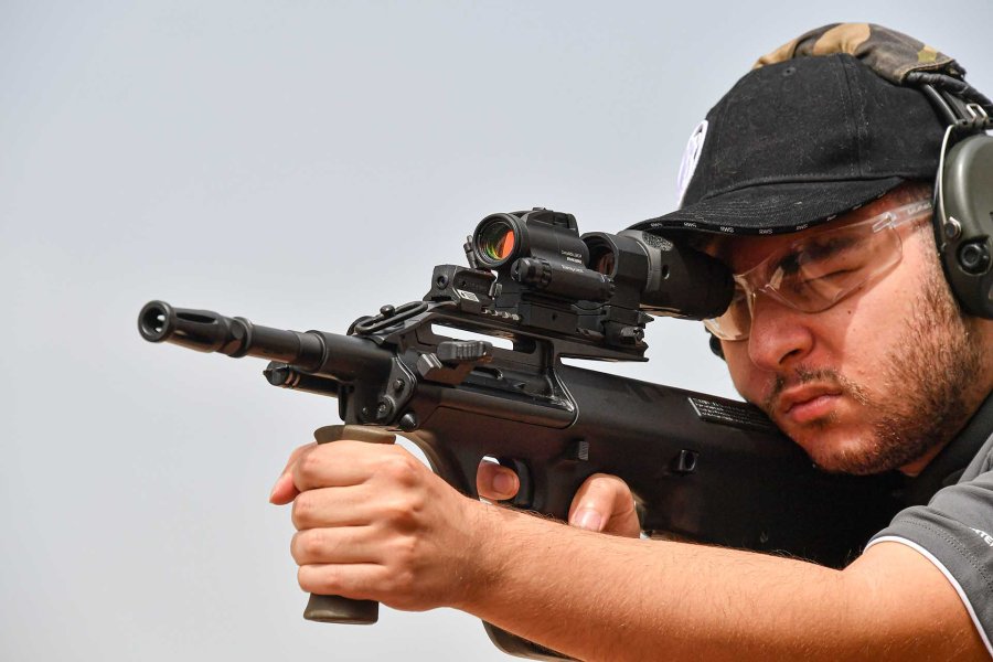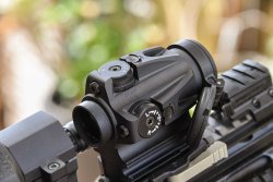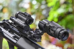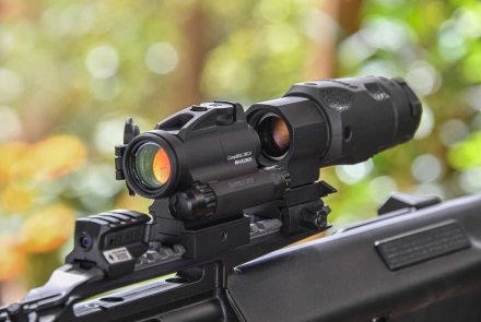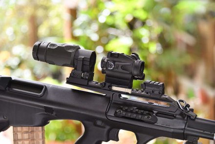 Mi sono divertito molto a usare il sistema di puntamento CompM5b sul mio AUG, e l'attacco flip-mount permette di spostare rapidamente l’aggiuntivo 3x sul lato, lasciando il punto rosso ad ingrandimento unitario per il tiro CQB.
