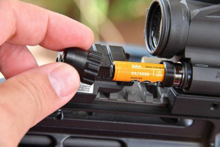 La durata della batteria è di ben 5 anni con il mirino costantemente acceso a luminosità 7, e fino a 10 anni impostato alla luminosità compatibile per l’uso con NVD. Il tutto con una singola batteria alcalina AAA, anche se per una migliore affidabilità si consiglia una batteria al litio-ferro da 1,5V.
