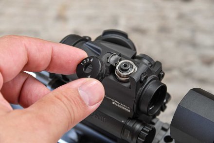 La regolazione della luminosità, con la manopola di comando posta nell'angolo in basso a sinistra del mirino rispetto al tiratore, è molto facile da raggiungere e da impostare, anche sopra allo AUG, notoriamente ostico con molte ottiche sul lato sinistro… dove si trova il tiretto di armamento. Non che sia necessario: il CompM5b può essere lasciato semplicemente "acceso" alla settima impostazione, sufficientemente luminoso per il tiro diurno, e la batteria durerà quasi quanto fosse lasciata riposare su uno scaffale... è una caratteristica degli Aimpoint che mi ha sempre colpito.