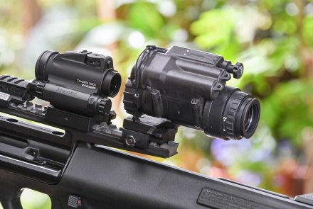 Ho montato l'Aimpont CompM5B su una carabina Steyr AUG-A2 con rotaia Picatinny, sfruttando l'altezza di 39 mm per utilizzare sia la combinazione di montaggio Twist/Flip Mount per l'ingranditore afocale 3XMag-1, sia un adattatore professionale N-Vision NVAT Twist Mount per lo NVD 6015 (la controparte civile del monoculare ad intensificazione di luce AN/PVS-14), per aggiungere le funzionalità di visione notturna al mirino a punto rosso Aimpoint. Ho anche installato la torretta "A" a 4 posizioni, che segue abbastanza bene le munizioni standard .223 da 62 grani da una canna da 16” fino a circa 400 metri.