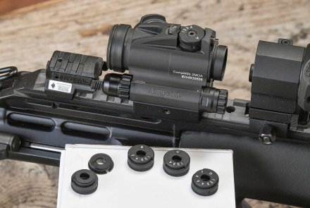 Il CompM5b è normalmente venduto in un pacchetto che comprende un attacco rail grabber LRP a leva, disponibile in due configurazioni che si differenziano solo per la presenza o meno di un distanziatore opzionale per sollevare l'asse ottico da 30 mm a 39 mm, essenziale per l’uso su armi basate su piattaforma AR15, consentendo il co-witnessing con le mire metalliche standard o BUIS. Nella confezione troviamo cinque torrette di elevazione sostituibili: una torretta personalizzabile in due pezzi e quattro profili balistici fissi preimpostati che possono essere utilizzati con vari calibri, tra cui .223 e .308. Inoltre, una volta montate, le torrette sono regolabili a mano, senza bisogno di attrezzi.