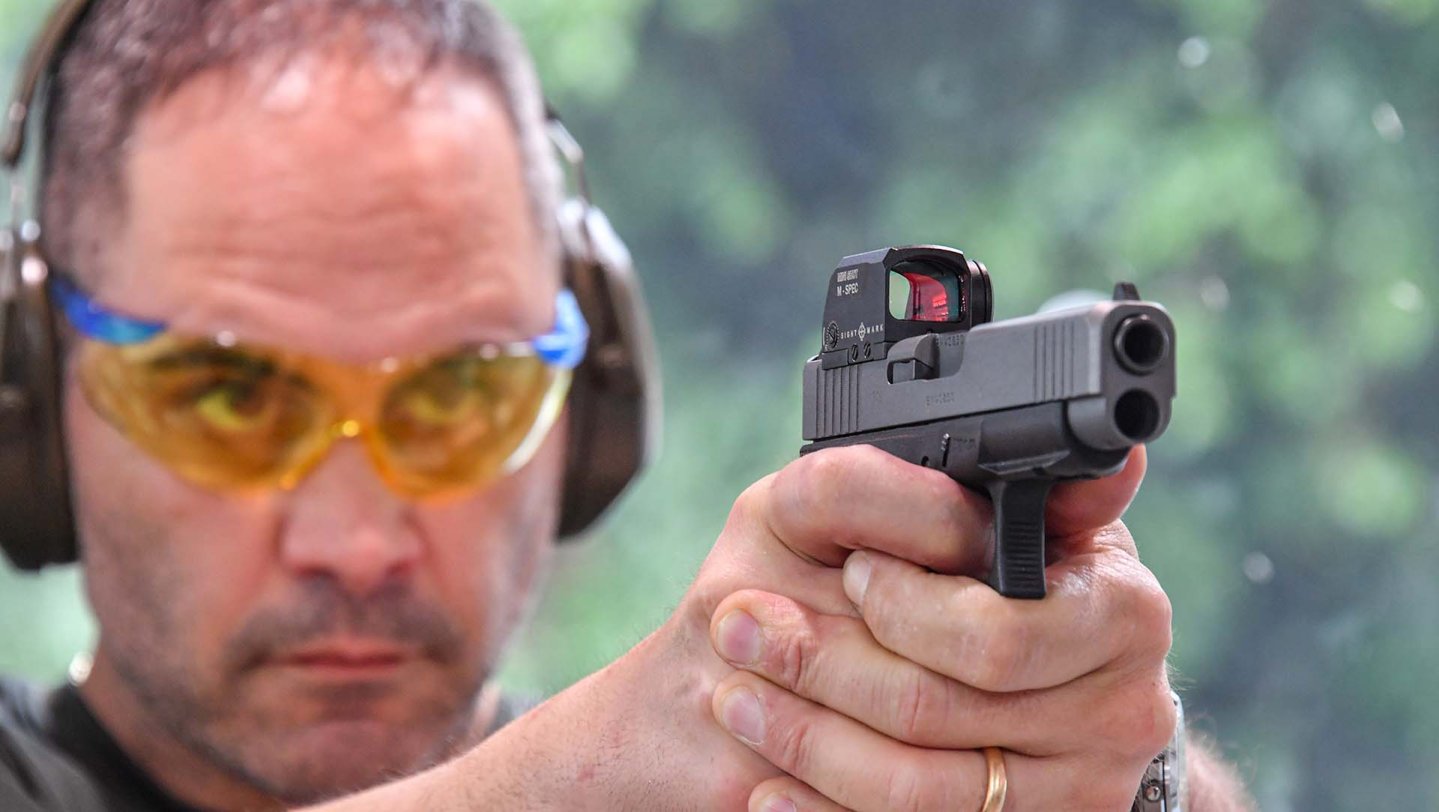 Il maneggio della Glock 48 Mos, una pistola compatta molto sottile in calibro 9 ideale per il porto occulto, con lo M3 Solar di Sightmark montato è molto agevole; lo spessore dell’ottica, a parte la batteria, corrisponde allo spessore del carrello dell’arma.