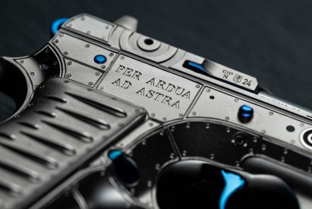 Il carrello della pistola è dotato di aperture ispirate agli scarichi del motore Rolls-Royce Merlin, il cui suono è rimasto impresso nella memoria degli aviatori in guerra. La superficie dell'arma ricorda i pannelli rivettati della fusoliera del caccia, mentre il design delle guancette richiama le ali dello Spitfire. Sulla guancetta sinistra è riportato il distintivo d'argento di un osservatore di campo – pilota cecoslovacco. Le fresature di armamento sulla parte posteriore del carrello richiamano il roundel, ovvero lo scudo della RAF, un simbolo circolare composto da cerchi concentrici. La decorazione della pistola è completata dall'incisione del distintivo di un pilota della RAF sulla base del caricatore, da uno scudetto circolare in argento sul lato destro del fusto e dal motto dalla RAF "PER ARDUA AD ASTRA" dietro di essa. Il suo fascino estetico è ulteriormente rafforzato dalla finitura brunita Rainbow Blue dei comandi.