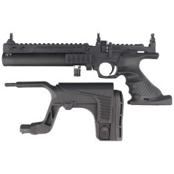 L’estetica della Hatsan Jet 1 riprende quella di una pistola per tiro accademico sottoposta a un una buona dose di “cattiveria”, questo grazie soprattutto alla finitura superficiale “all black” e alle slitte per il montaggio dell’ottica. A completare l’effetto “tactical” c’è anche e soprattutto il calciolo amovibile in polimero, telescopico e con poggiaguancia regolabile, che di fatto permette di trasformare la pistola in una mini-carabina assai compatta. Anche l’impugnatura semianatomica, con il suo esteso appoggio inferiore, contribuisce a rendere l’aspetto di questa pistola un ibrido tutto sommato intrigante. Di serie la Hatsan Jet 1 monta un set di mire costituito da una tacca regolabile in altezza e deriva e un mirino Truglo con inserto in fibra ottica. La pistola è comunque predisposta per il montaggio del cannocchiale, con un classico binario da armi ad aria compressa dalla larghezza di 11mm/22mm. Questo permette di utilizzare la maggior parte di ottiche per armi PCP con attacchi dedicati presenti sul mercato e anche di sbizzarrirsi montando in posizione laterale qualche accessorio stravagante.