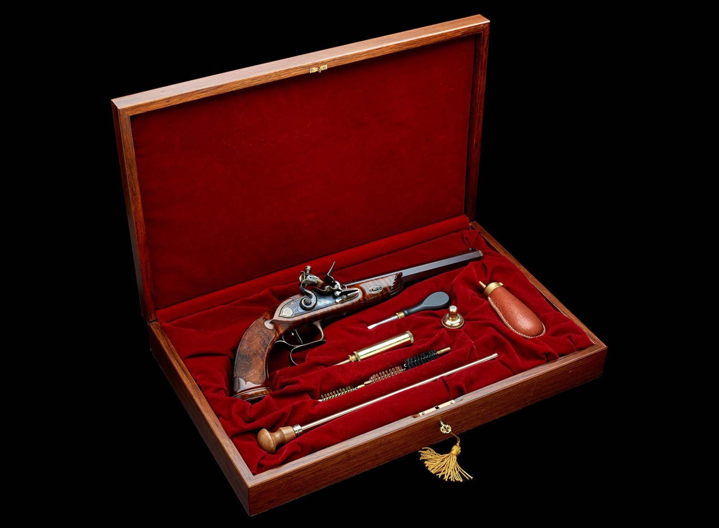 Quella prodotta dalla Davide Pedersoli è la replica di una pistola da duello fabbricata da Henry Le Page tra il 1840 e il 1850 ed è un’arma che mette al primo posto la precisione, particolarmente sfruttabile grazie a dettagli come il grilletto dotato di alleggeritore di scatto (stecher) e la tacca di mira regolabile in senso verticale. La pistola Le Page di Pedersoli è disponibile sia con batteria a pietra sia a percussione, in versione standard o Deluxe. Il calcio è in noce europeo zigrinato e lucidato a olio, ma è disponibile anche la versione “Maple” con calcio in legno d’acero dalla caratteristica essenza tigrata, lucidato a olio manualmente.