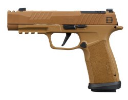 Rifinito con un resistente trattamento superficiale Cerakote color Coyote, per un aspetto distinto, il carrello in acciaio inossidabile include fresature di presa anche anteriori e tagli di alleggerimento specifici per il modello. Il carrello è predisposto per l'ottica e con impronta compatta SIG-LOC, consentendo il montaggio diretto di mirini a punto rosso compatibili, mentre gli orgaani di mira meccanici X-RAY3 per uso diurno e notturno sono sempre utilizzabili una rapida acquisizione del bersaglio in condizioni di luce variabili.