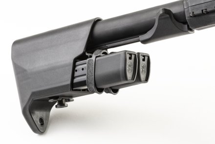 La Smith & Wesson M&P FPC può anche trasportare due caricatori aggiuntivi all’interno del calcio. Qui i due caricatori vengono bloccati saldamente da una linguetta a sgancio rapido. La carabina M&P FPC è compatibile con i caricatori bifilari delle pistole full-size e compatte M&P.
