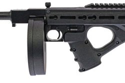 Le carte il regolale ha tutte: un aspetto originale ma ispirato a un’arma iconica, un calcio di tipo thumbhole pensato per il tiro a due mani, una slitta Picatinny per montare un punto rosso, una canna da 136 millimetri (5.3/8”) e soprattutto un caricatore a tamburo dalla capacità di 50 colpi che ricorda inevitabilmente quello del mitra Thompson.