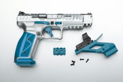 Ciò significa che la Rival-S può essere utilizzata con profitto nelle discipline di tiro che richiedono precisione. Non ci sono stati malfunzionamenti da segnalare durante i test. Durante il nostro test abbiamo notato che la delle guancette in alluminio blu è poco grippante. Tuttavia, questi pannelli di impugnatura blu disponibili in taglia S/M o L fanno parte di un set opzionale, che comprende anche un pulsante di sgancio del caricatore esteso, una leva di sgancio del carrello, una minigonna e due basi per il caricatore dello stesso colore per un costo aggiuntivo di 189 euro. Questo set è disponibile anche nei colori rosso e bronzo. Le guancette standard nere della Rival-S con rivestimento Tenifer scuro o cromate in bianco ci piacciono molto di più in termini di controllabilità durante lo sparo. Naturalmente, si può ovviare a questo problema con semplici ed economici accorgimenti di messa a punto, come l'applicazione di nastro da skateboard. Personalmente, siamo rimasti un po' infastiditi dal pulsante di sgancio del caricatore troppo grande, che scava letteralmente nel tallone della mano d'appoggio. La gamma di accessori comprende anche guancette per l'impugnatura in vari legni naturali per 69 euro o un compensatore che può essere montato sul fusto per 298 euro.