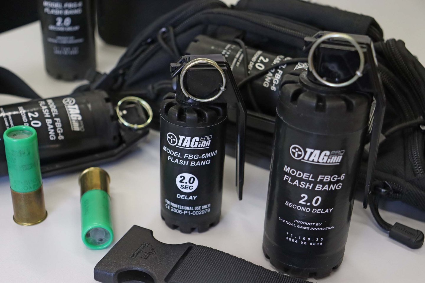 Le TAGinn pro MODEL FBG-6 Flash Bang 2.0 è una granata stordente con un’attivazione di due secondi da quando si estrae la spoletta e si rilascia la leva d’attivazione e ha un’emissione acustica di intensità pari a 140 Db. Durante le simulazioni queste granate (le chiamiamo così per convenzione, in realtà legalmente non lo sono) ci sono sembrate molto realistiche e impiegabili in sessioni addestrative. Il loro costo contenuto le rende sicuramente appetibili. Le confezioni sono da sei pezzi; ne esistono anche versioni con intensità sonora inferiore.