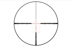 Прицельная сетка во второй фокальной плоскости представляет лишь очень резкую, подсвечиваемую прицельную марку, яркость которой может настраиваться на 9 различных степеней, она включается автоматически при увеличениях от 1x до 2.5x; прицельная сетка в первой фокальной плоскости является обычной вытравленной на стекле сеткой типа “милитари”, центральная часть которой подсвечивается при увеличении более 2.5x, когда прицельная марка сетки во второй фокальной плоскости отключена.
