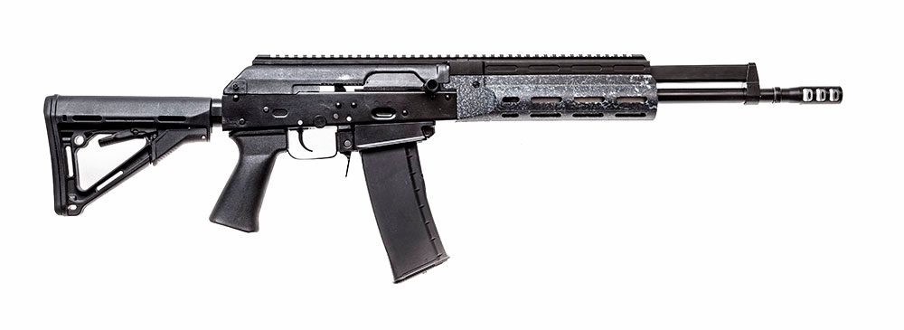 Возвратная пружина затворной рамы находится в штампованной ствольной коробке со смещением влево от оси оружия. Запирание ствола осуществляется традиционным «Калашниковским» поворотным затвором с двумя боевыми упорами. Рукоятки взведения затвора выполнены на обеих сторонах затворной рамы и движутся вместе с ней при стрельбе.